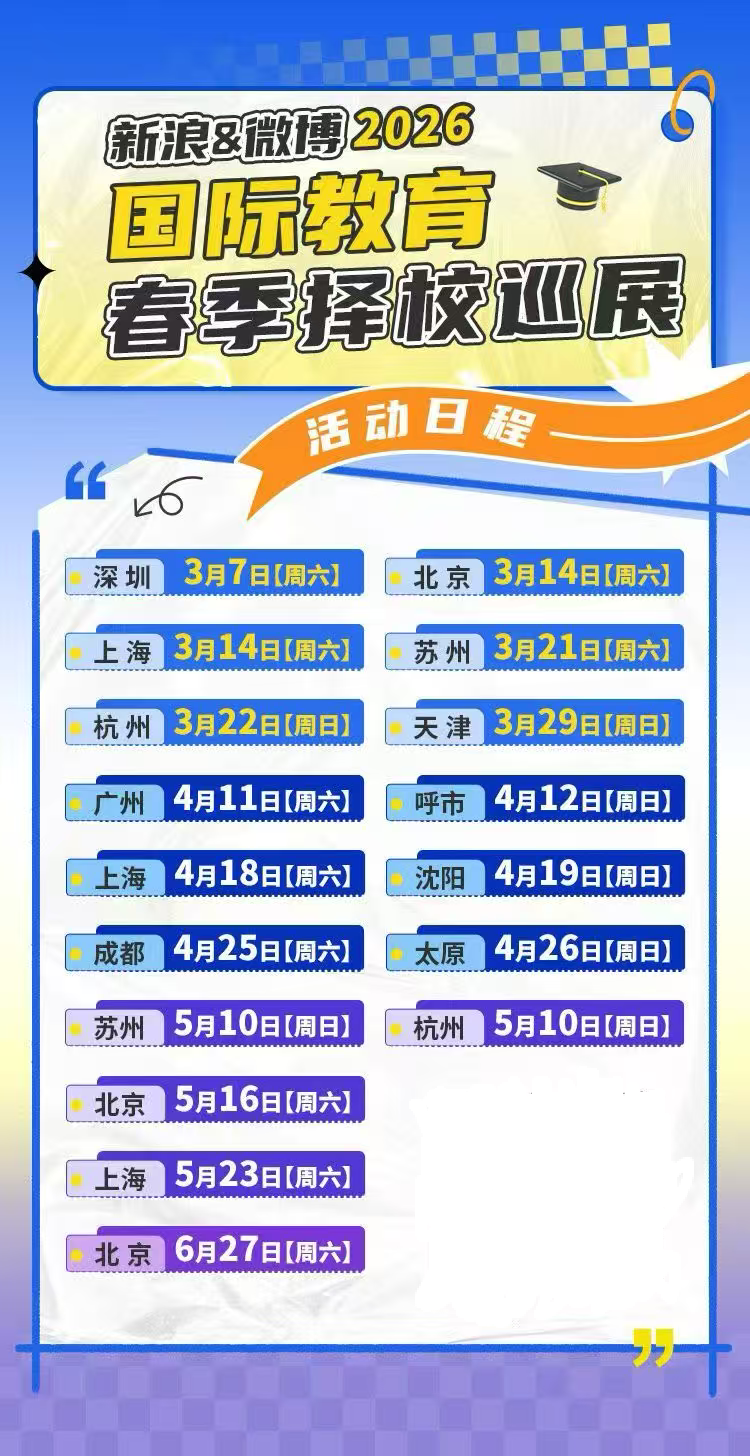 新浪教育、微博教育携手择校行联合打造的新浪&微博2026国际教育春季巡展将于3月启动。本次巡展为期4个月,覆盖全国11座城市,集结近300所优质国际化学校及200余位教育专家,旨在为中国国际教育家庭提供从幼儿园至高中的全学段、一站式升学规划服务。
